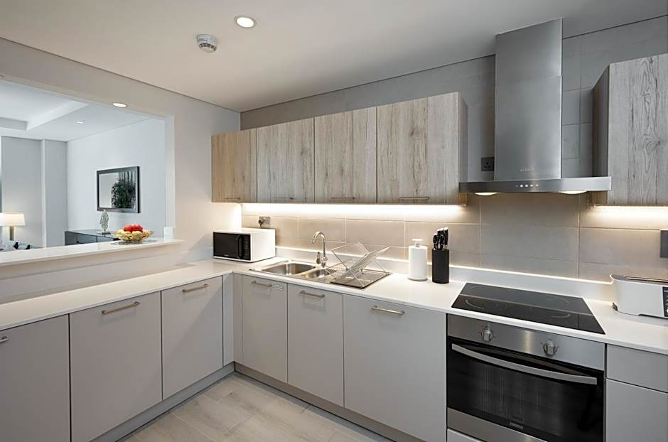 Our Executive Two Bedroom Apartments offer views of the surroundings residences, sprawling views of West Bay, and the Doha Corniche. These generously sized apartments enjoy 166 to 174 square metres of living space that include a sprawling living and dining area with floor-to-ceiling windows, a master bedroom with a King-size bed, and a smaller bedroom with twin beds. The bathroom in the master bedroom has a bathtub and a shower while the second bathroom features a shower. Each apartment can comfortably accommodate families, groups of friends, or up to 5 adults and 2 children. The living and dining area comprises a fully equipped kitchen which features induction stoves, an oven, microwave, fridge and freezer, and all necessary cooking equipment, in addition to a washing machine and tumble dryer, and a dishwasher. Highspeed Wi-Fi access is available with our compliments throughout your stay. All bedrooms have Smart TVs, independent work areas in the living room and bedrooms, and other amenities include air-conditioning, plus tea and coffee-making facilities, iron and ironing board, telephone and an in-room safe. Accessible apartments available upon request